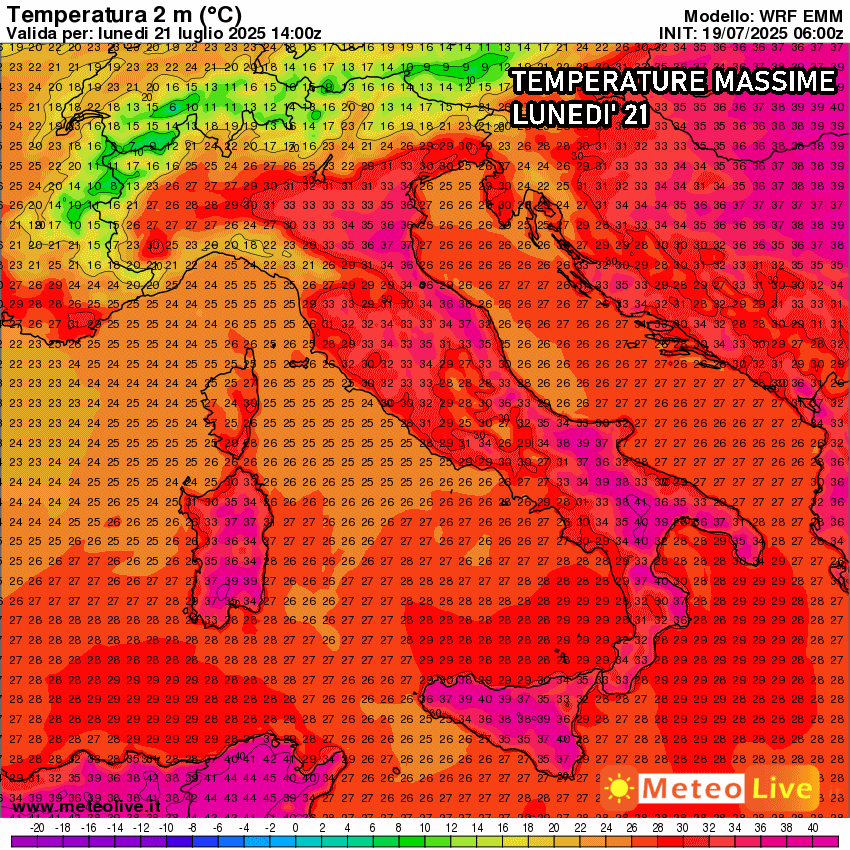 Entreremo nel picco di questa lunga ondata di caldo ad inizio settimana. Nella giornata di lunedì 21 luglio, le massime oscilleranno tra i 35 e i 42 °C su buona parte dei territori interni del Sud, mentre sulle città costiere la colonnina di mercurio si aggirerà tra i 29 e i 34 °C. Picchi eccezionali sono possibili nelle zone interne della Sicilia, fino a 43 °C. Farà caldo anche al Nord, sia chiaro, ma sul settentrione ci sarà un maggior rischio di instabilità, con acquazzoni e temporali, specie sul nord-ovest e le Alpi.