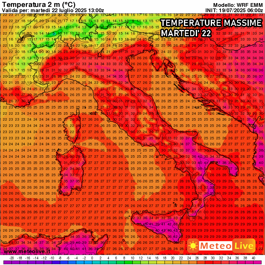 Altra giornata di fuoco quella di martedì 22 luglio, con temperature spropositate su tutto il meridione. Picchi fino a 43 °C, o anche qualcosina in più, nelle zone interne della Sicilia tra Agrigentino, Siracusano, Ragusano e Catanese. Fino a 40 o 41 °C nelle zone interne della Calabria e fino a 39 o 40 °C tra Basilicata ed entroterra pugliese.