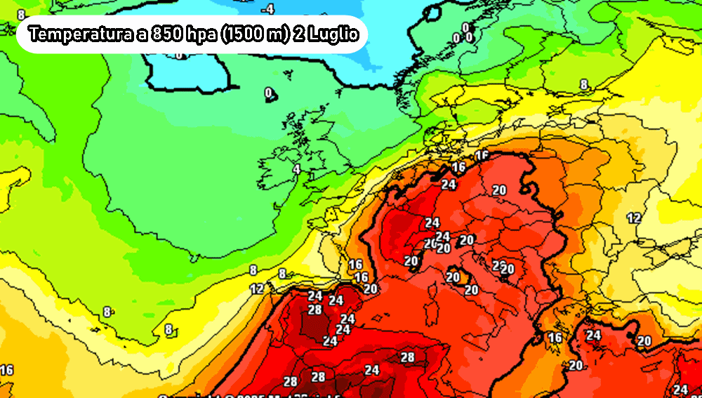 Come ci mostra il modello americano GFS, nei primi due giorni di luglio potrebbero transitare masse d’aria estremamente calde su mezza Europa, in particolar modo tra Francia, Germania, Austria e Svizzera. Insomma, sull’Europa centrale si prevedono temperature a 1500 m di altitudine (850 hPa) vicine ai 24 o 25 °C, ovvero temperature spropositate per l’estate e per questi territori.