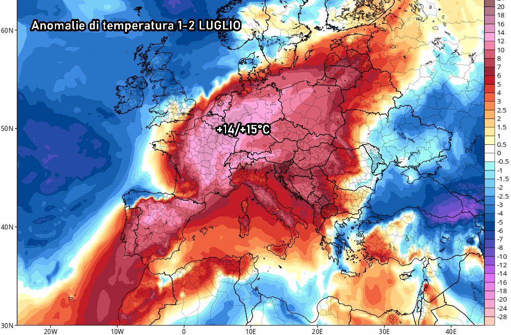 Si tratta di temperature di almeno 14 o 15 °C superiori alle tipiche medie del periodo per quanto riguarda l’Europa centrale, il che vorrebbe dire che in pianura le temperature potrebbero agevolmente raggiungere i 40 °C e oltre.