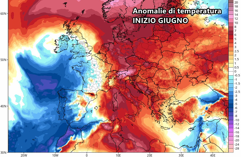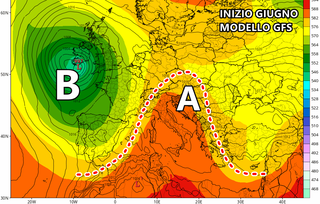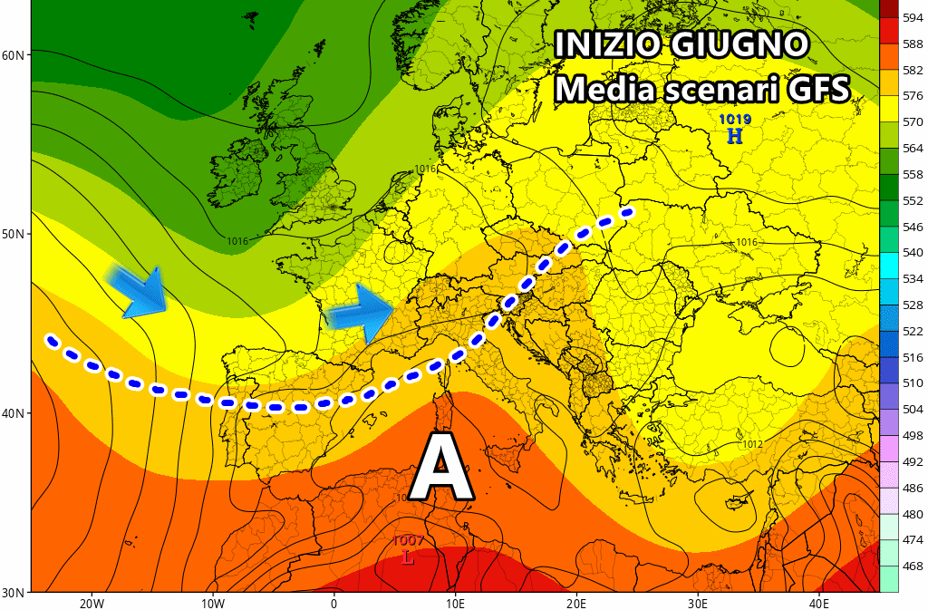 Con l’arrivo di giugno, invece, le carte in tavola potrebbero improvvisamente mutare su gran parte d’Europa. Il modello americano GFS mostra un’acutizzazione delle figure bariche sia sull’Atlantico che sul vecchio continente proprio all’avvio del prossimo mese. L’approfondimento delle depressioni sull’Atlantico orientale e sulla Gran Bretagna potrebbe favorire un tipico schema da NAO positiva, dove l’alta pressione subtropicale si erge con facilità sul Mediterraneo e l’Europa centrale, garantendo un periodo di maggior stabilità e soprattutto ben più caldo.
