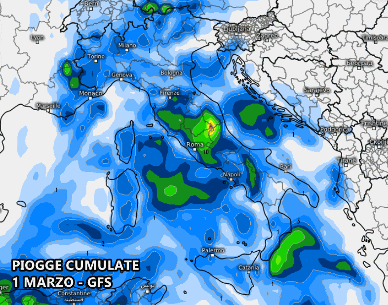 Tuttavia, ci sono ancora parecchie incertezze sulla disposizione delle figure bariche nella giornata del 1° marzo. Ad esempio, il modello americano GFS mostra una lacuna barica piuttosto insistente su buona parte d’Italia, che favorirebbe la presenza di piogge sparse da Nord a Sud in un contesto simil-autunnale.
