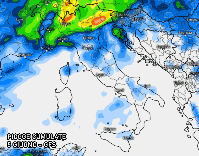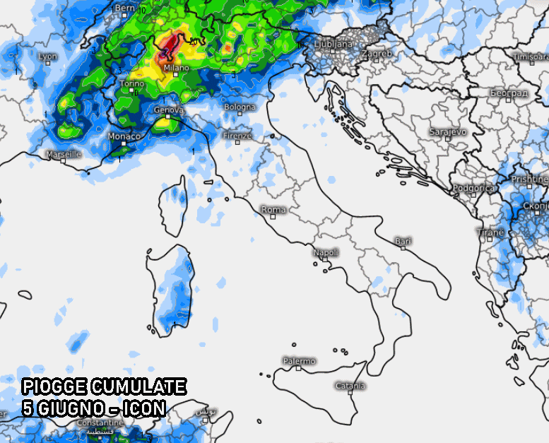 Le precipitazioni previste per giovedì 5 giugno mostrano accumuli su parte del nord, con picchi su alta Lombardia (la regione più a rischio), Trentino, alto Veneto e Friuli (anche oltre 30-40 mm), indice della presenza di forti temporali. Oltre alla pioggia sarebbe elevato il rischio di grandinate e colpi di vento.
