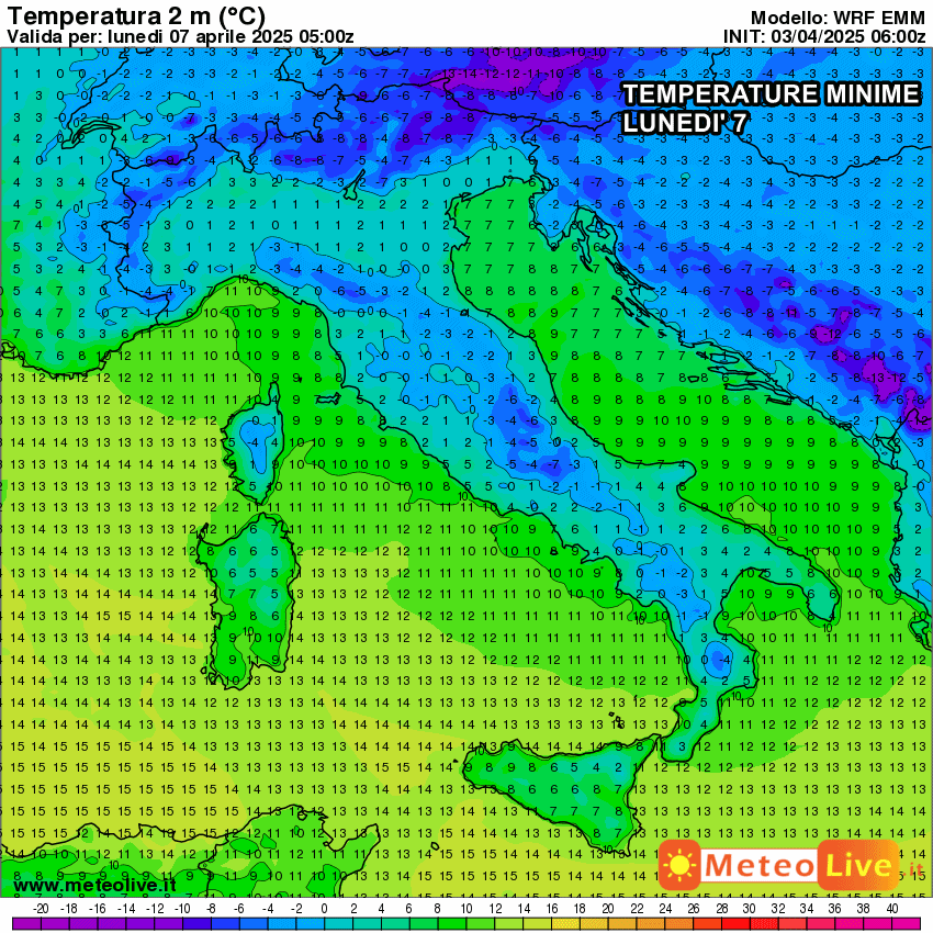 Passato il fronte freddo, tornerà il sereno su gran parte dello Stivale, ma il freddo resterà ben ancorato sul Mediterraneo centrale almeno fino a mercoledì. Se di giorno le temperature riusciranno a portarsi anche al di sopra dei 15 o 16 °C in presenza del Sole, lo stesso non si potrà dire per la notte: la presenza dell’aria fredda, unita al fenomeno dell’irraggiamento notturno, favorirà un vero e proprio tracollo delle temperature minime.