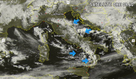 Oggi è una giornata fredda ma leggermente meno perturbata rispetto a ieri. Si denotano maggiori spazi soleggiati specie al nord, sul medio-alto Tirreno e sul lato ionico. Insistono addensamenti sul basso Tirreno ed il medio Adriatico: sarà proprio su questi settori che potremo imbatterci in acquazzoni e piovaschi sparsi (nel mirino Calabria tirrenica, Basilicata, Campania, Molise, Abruzzo).
