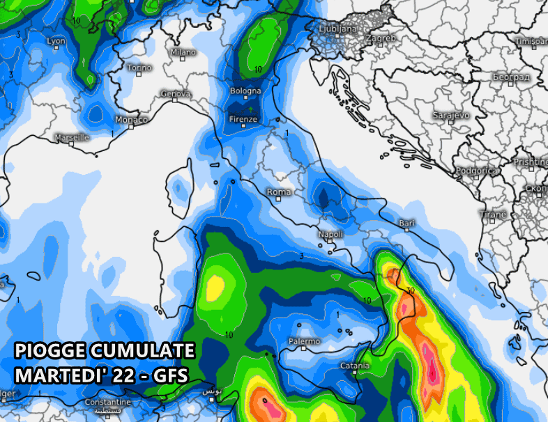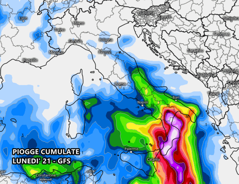 Tra sabato e domenica ci saranno le prime forti piogge al sud, con accumuli superiori ai 60-70 mm tra Sicilia e Calabria, fino a 30-40 mm su Basilicata, Puglia e Campania. Ma la situazione più critica potrebbe arrivare ad inizio prossima settimana, quando il ciclone si piazzerà sul canale di Sicilia e richiamerà turbolente e umidissime correnti di scirocco su gran parte del Sud.