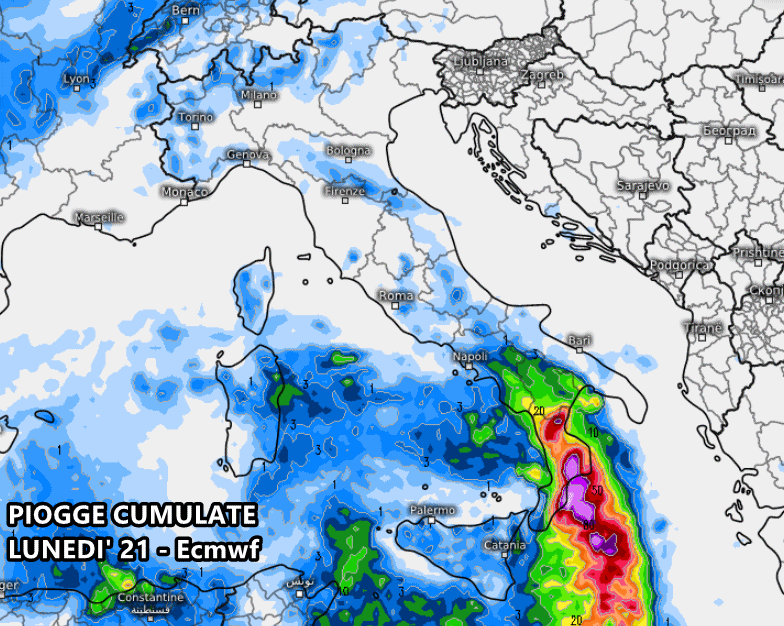 Anche il modello europeo ECMWF concorda con un vigoroso coinvolgimento della Calabria ionica, sebbene con accumuli meno esagerati (ma comunque significativi, oltre 100 mm).