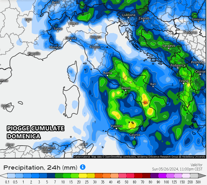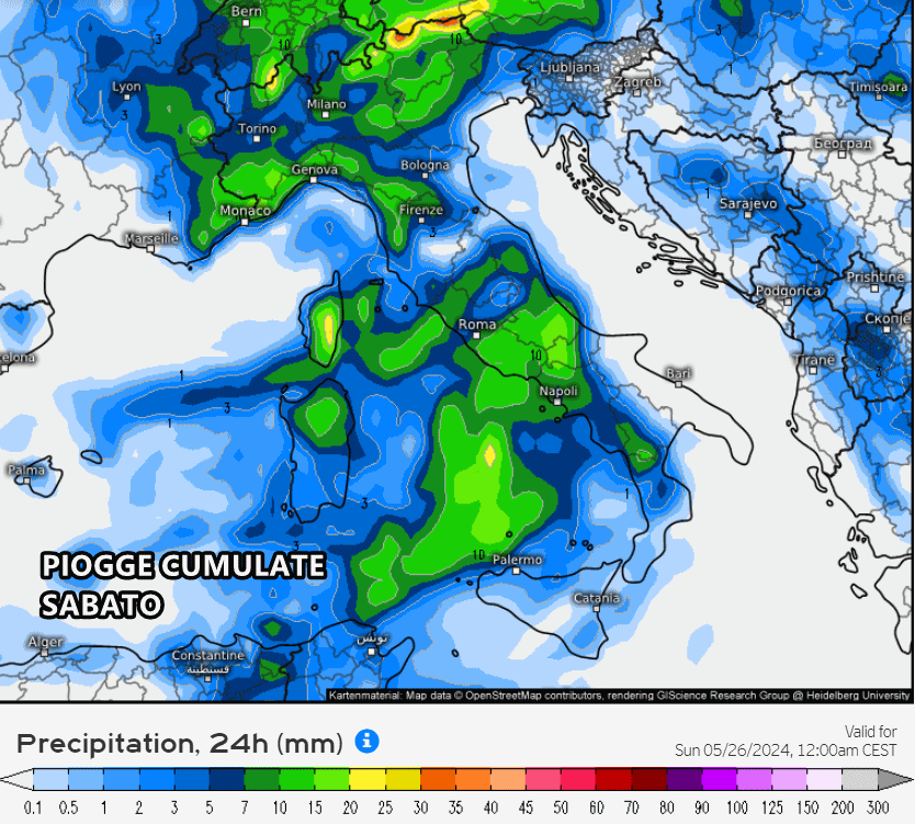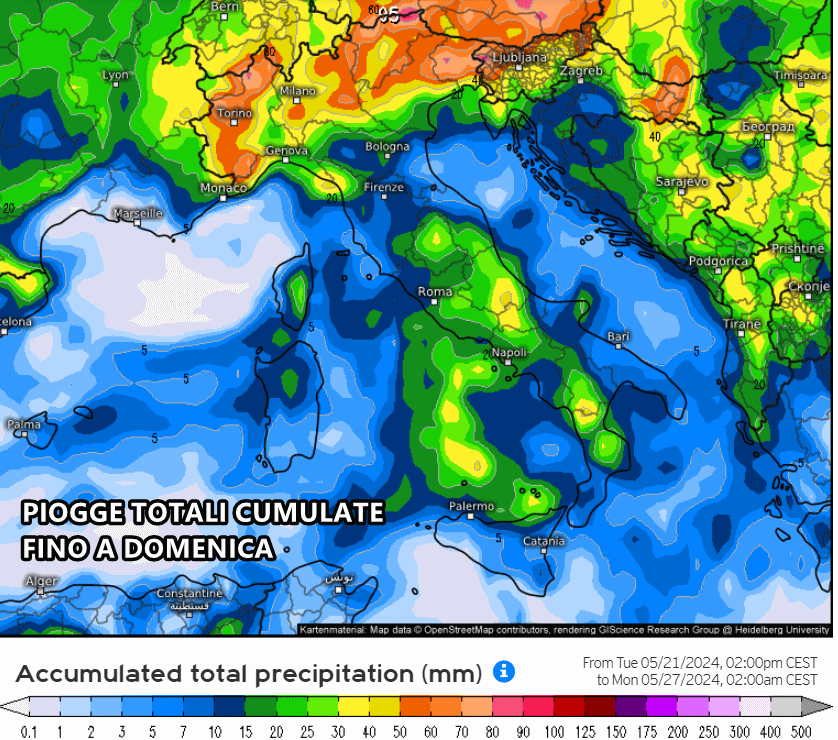 Nel computo totale delle precipitazioni previste fino al termine della settimana possiamo notare una maggiore presenza di piogge e accumuli abbondanti sul Nord Italia, ma come potete ben vedere l’ombrello occorrerà anche sul resto della nostra penisola.