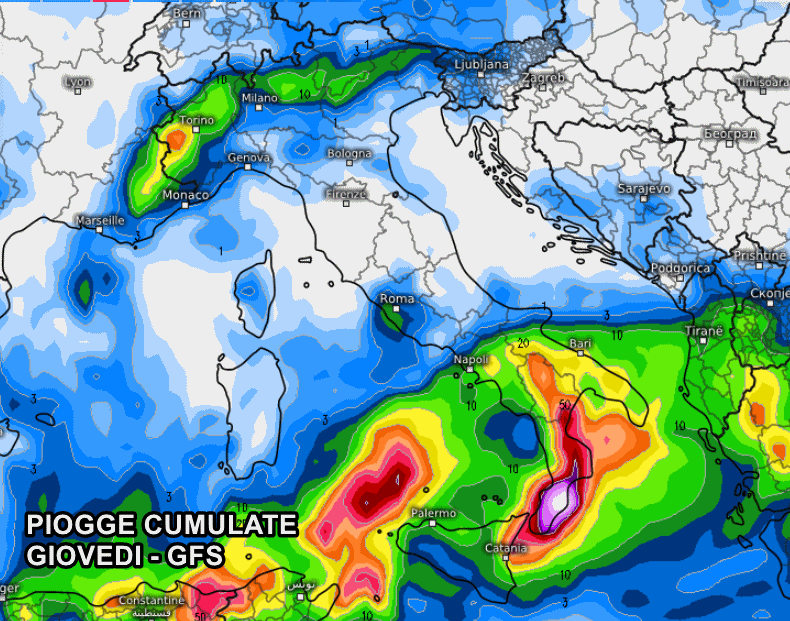 Ma dove colpirà questo ciclone? Chiariamo che non è ancora del tutto certa la traiettoria di questa depressione insidiosa, ma a quanto pare potrebbe svilupparsi tra mercoledì sera, giovedì e venerdì. Gli ultimi aggiornamenti del modello americano GFS pongono gran parte del Sud al di sotto di forti precipitazioni, soprattutto fra Sicilia e Calabria, dove si prevedono accumuli di pioggia totali addirittura superiori ai 150 mm sull’arco ionico.