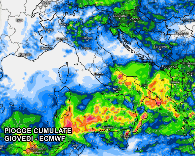 Abbastanza concorde il modello europeo ECMWF, con la sola differenza di un minimo depressionario un po’ più a nord, che di conseguenza vedrebbe un maggior coinvolgimento della Sardegna e del Medio Adriatico. Il Nord quasi certamente si troverà ai margini di questa insidiosa depressione, ma in ogni caso potrebbe fare i conti con improvvisi forti temporali serali in Val Padana.