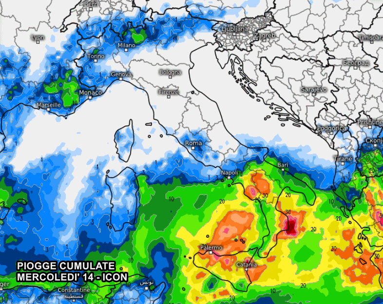 Il modello ICON mostra un chiaro e netto coinvolgimento di tutto il Sud Italia, in particolar modo di Calabria e Sicilia, dove potrebbero arrivare piogge diffuse e anche di forte entità, con rischio di nubifragi, soprattutto a ridosso dei monti.