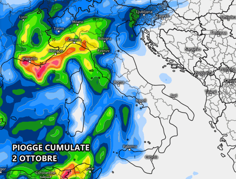 Le prime stime riguardo le precipitazioni previste sono davvero notevoli. Il peggioramento potrebbe cominciare mercoledì 2 ottobre con piogge e temporali su nord Italia e Toscana. Già in questa prima fase del peggioramento potrebbero verificarsi temporali localmente forti tra basso Piemonte, Lombardia e Liguria, con accumuli localmente superiori ai 60-70 mm.
