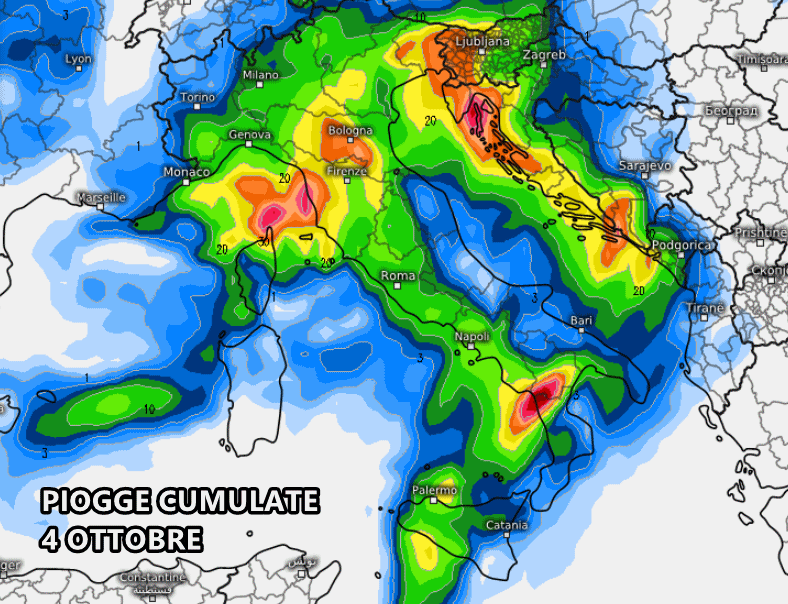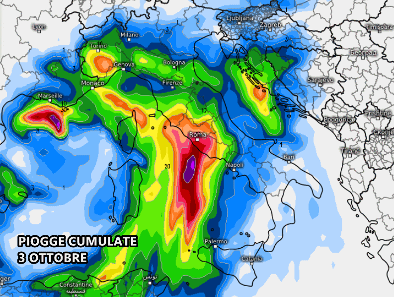 La depressione potrebbe consolidarsi ulteriormente nel corso del 3 ottobre: un potente sistema temporalesco potrebbe risalire dal basso Tirreno andando a colpire gran parte del centro Italia e la Sicilia. Non a caso gli accumuli previsti sono davvero ragguardevoli, anche superiori ai 100 mm in 24 ore nel Lazio e su Roma. Lungo questo vasto sistema temporalesco confluirebbero sia le calde correnti di scirocco che le fresche correnti provenienti da ovest, a cui si unirebbe l’elevata energia rilasciata dal Mediterraneo.