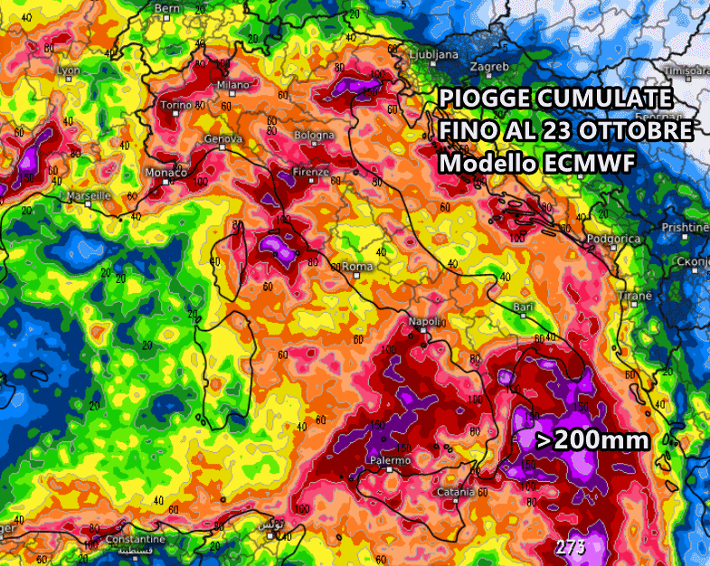 Notevoli gli accumuli di pioggia previsti dal modello europeo ECMWF fino al 23 Ottobre, tutti appartenenti ad una sola ondata di maltempo. Prima toccherà al nord e al medio-alto Tirreno, dove troviamo ancora una volta piogge importanti, anche oltre 100 mm (in viola).