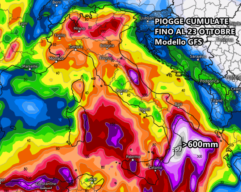 Davvero estremo, invece, l’aggiornamento del modello americano GFS. Il settore ionico potrebbe assistere ad un autentico alluvione nel periodo tra 19 e 23 Ottobre. Il ciclone stazionante tra Sardegna, Sicilia e Marocco darebbe vita a enormi sistemi temporaleschi sul mar Ionio, pronti a investire senza tregua il settore ionico dalla Puglia alla Sicilia. Sulla Calabria ionica si prevedono accumuli di pioggia totali, fino al 23 Ottobre, superiori ai 600 mm. Parliamo di numeri esorbitanti che, nel caso in cui dovessero davvero realizzarsi, potrebbero scatenare situazioni di estremo disagio idro-geologico.