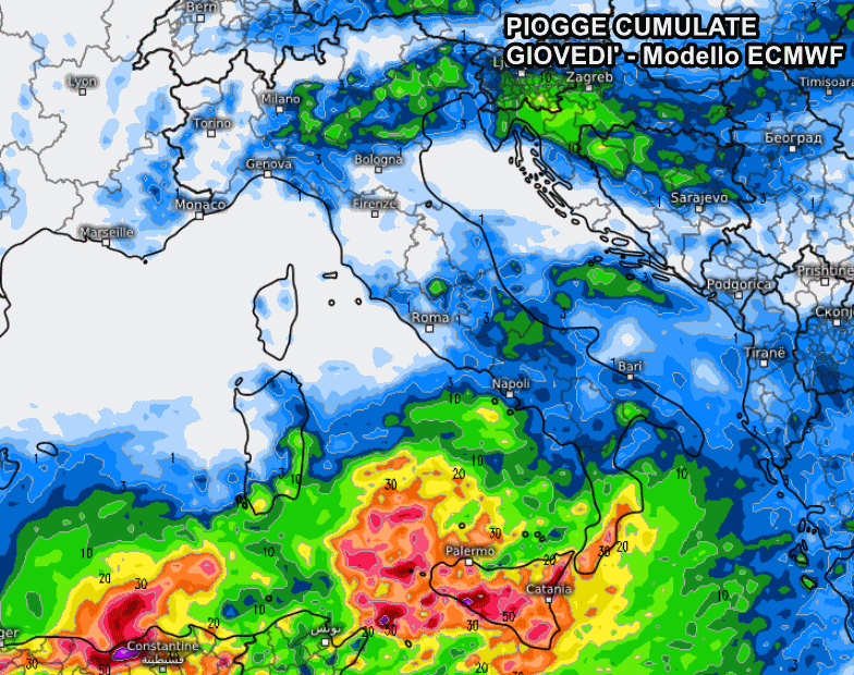 Eloquenti le piogge attese giovedì secondo il modello europeo ECMWF. La Sicilia sarà senz’altro la regione più colpita dalle piogge e dai temporali, di stampo chiaramente autunnale. In effetti si tratta di una perturbazione abbastanza insolita per il mese di Maggio, resa possibile dal particolarmente schema barico presente sull’Europa. Gli accumuli potrebbero superare i 100 mm in Sicilia, specie a ridosso dei monti. Colpita anche la Calabria ionica dalle forti piogge.