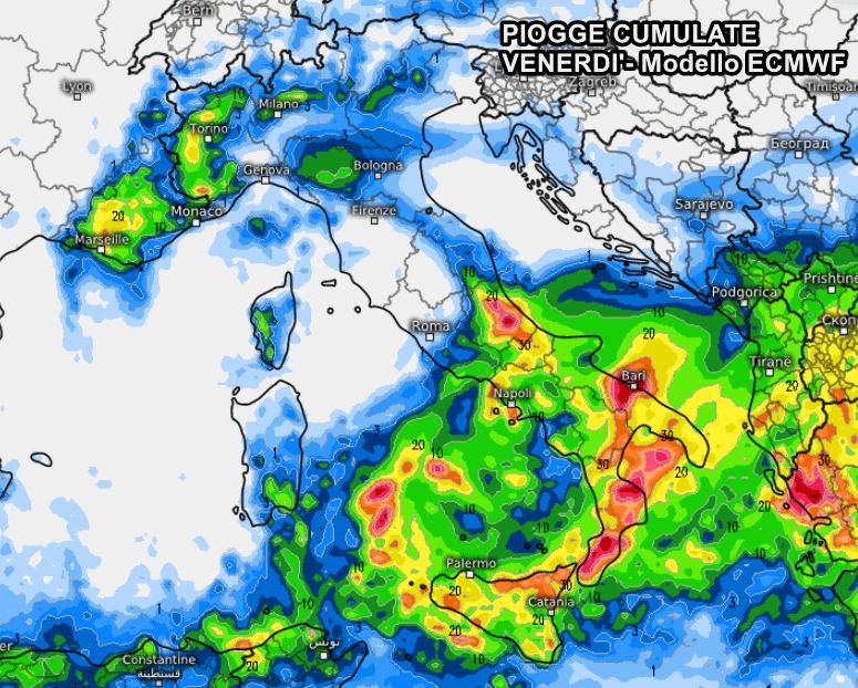 Ancora maltempo diffuso venerdì, questa volta anche su Basilicata, Campania, Puglia, Molise e Abruzzo. Su Puglia centrale, Calabria e Sicilia nord-orientale si prevedono oltre 60-80 mm di pioggia, così come sull’Abruzzo centrale. Da non sottovalutare le mareggiate sul mar Ionio: le onde potrebbero superare i 6 metri di altezza sotto costa.