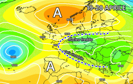 Un nucleo freddo continentale, proveniente dalla Russia, si fionderà sull’Europa centro-occidentale comportando un calo termico alle medio-alte quote anche sul nord Italia, proprio tra mercoledì 19 e giovedì 20 Aprile. Nel frattempo un nucleo instabile atlantico, umido nei medio-bassi strati, scivolerà dapprima sulla Francia e successivamente sul nord Italia. L’interazione tra queste differenti masse d’aria comporterà un sensibile incremento dell’instabilità sul Settentrione.