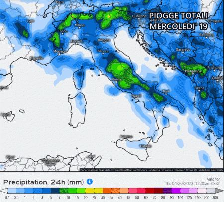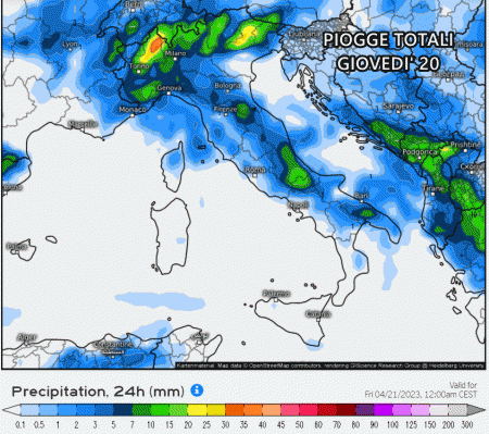 Giovedì 20 sarà la giornata più perturbata al nord Italia. Piogge diffuse sul Nordovest, con isolati accumuli superiori ai 30-40 mm, specie su Piemonte, alta Lombardia, Trentino. Rovesci sparsi, soprattutto al pomeriggio, su Liguria, zone interne di Emilia Romagna, Toscana, Abruzzo, Marche, Umbria, Puglia. I contrasti termici, più accesi al nord, potrebbero dar luogo a grandinate degne di nota in corrispondenza dei temporali.