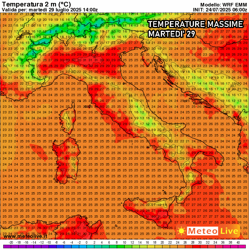 Eloquenti le temperature massime previste per martedì 29 luglio: si prevedono valori in pieno giorno addirittura inferiori ai 25 °C su molte località del Medio Adriatico, anche in virtù di nubi residue e piovaschi. Un pochino più caldo al Nord, con picchi di 30 o 31 °C, ma in un contesto estremamente più sopportabile e asciutto rispetto alle scorse settimane.