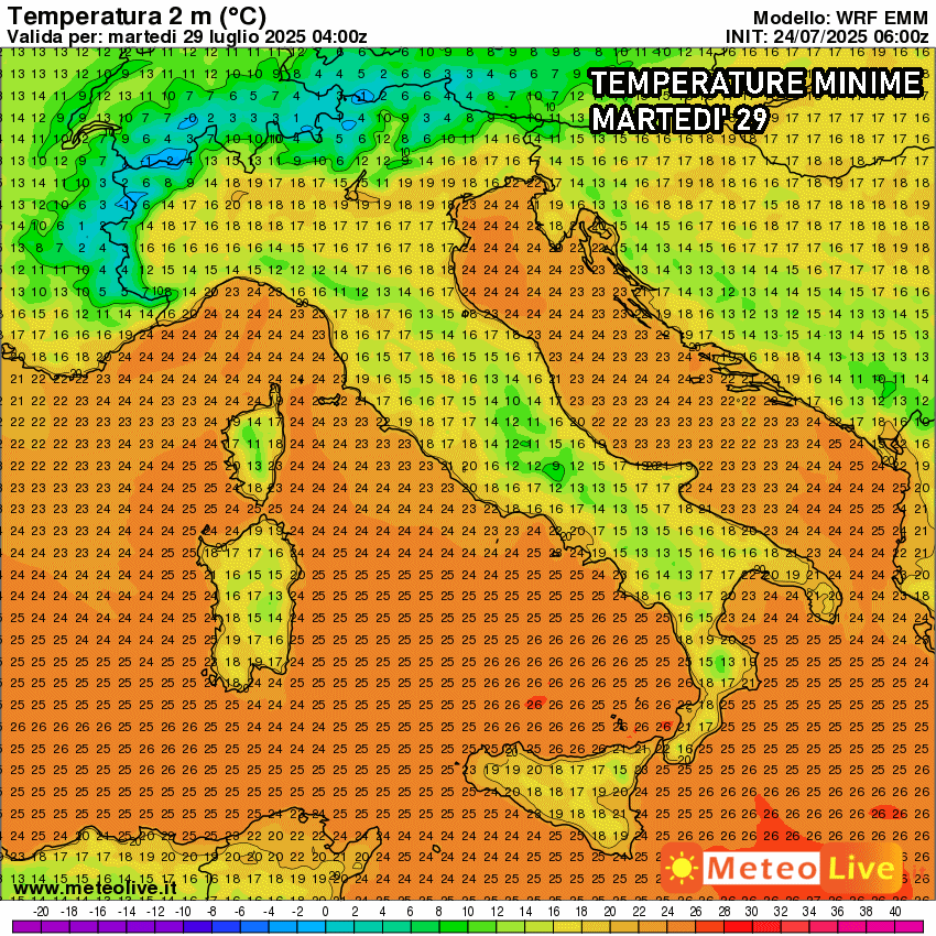 Le minime notturne di martedì mostrano la chiara invasione di aria più fresca, che trascinerà i termometri anche al di sotto dei 17 o 16 °C nelle zone interne e nelle valli del centro Italia, e fino a 16 °C anche in Val Padana o nelle zone interne del Sud.