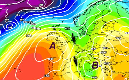 Il modello europeo invece vede per la stessa data un affondo ben più convinto, come intensità e portata, soprattutto viene ridotto il ruolo dell’alta pressione: