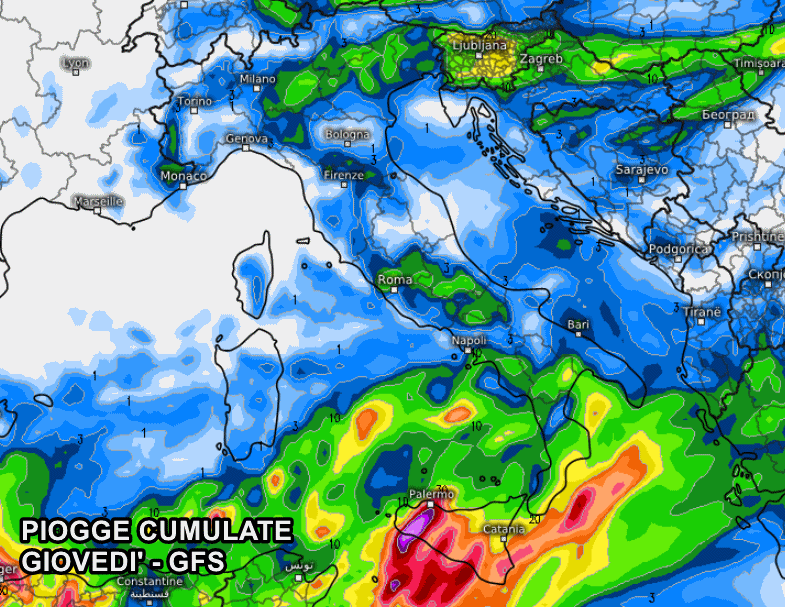 Nel corso di questo giovedì, il maltempo investirà tutto l’estremo sud, in particolar modo la Sicilia, dove si prevedono accumuli di pioggia davvero sostanziosi, decisamente insoliti per il periodo. Per i terreni, si tratterà senz’altro di una discreta passata piovosa, ma come spesso accade in queste circostanze, su diversi territori potrebbero precipitare quantitativi di pioggia troppo elevati in brevi archi di tempo. Ad esempio, sulla Sicilia centro-meridionale si prevedono accumuli di pioggia localmente superiori ai 100 mm. Nel frattempo, le piogge si estenderanno velocemente alla Calabria, alla Basilicata e alla Puglia meridionale tra pomeriggio e sera, oltre che sulla Sardegna meridionale.