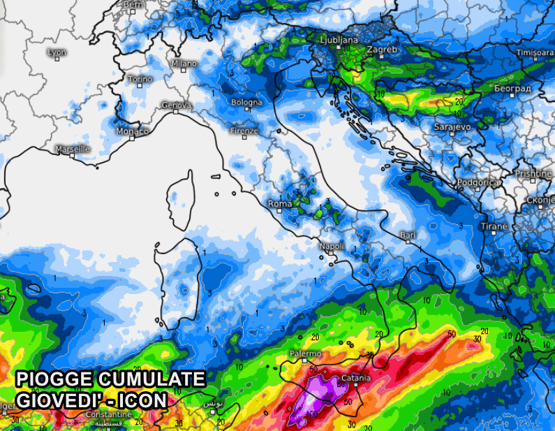 Ancor più severo l’aggiornamento del modello ICON, che propone quantitativi di pioggia spropositati sulla Sicilia meridionale. Addirittura, potrebbero precipitare in sole 24 ore oltre 150 o 200 mm di pioggia, specie a ridosso dei rilievi.