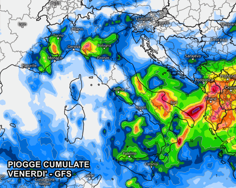 Il maltempo investirà il sud anche nella giornata di venerdì, poiché il minimo di bassa pressione evolverà molto rapidamente verso est-nordest. Le piogge colpiranno la Puglia, la Basilicata, il Molise e l’Abruzzo, con accumuli variabili tra i 30 e i 90 mm, soprattutto sulla Puglia centro-meridionale. Da non sottovalutare il maltempo atteso anche al Nord sia giovedì che venerdì, poiché potrebbero svilupparsi molti temporali sparsi ma intensi.
