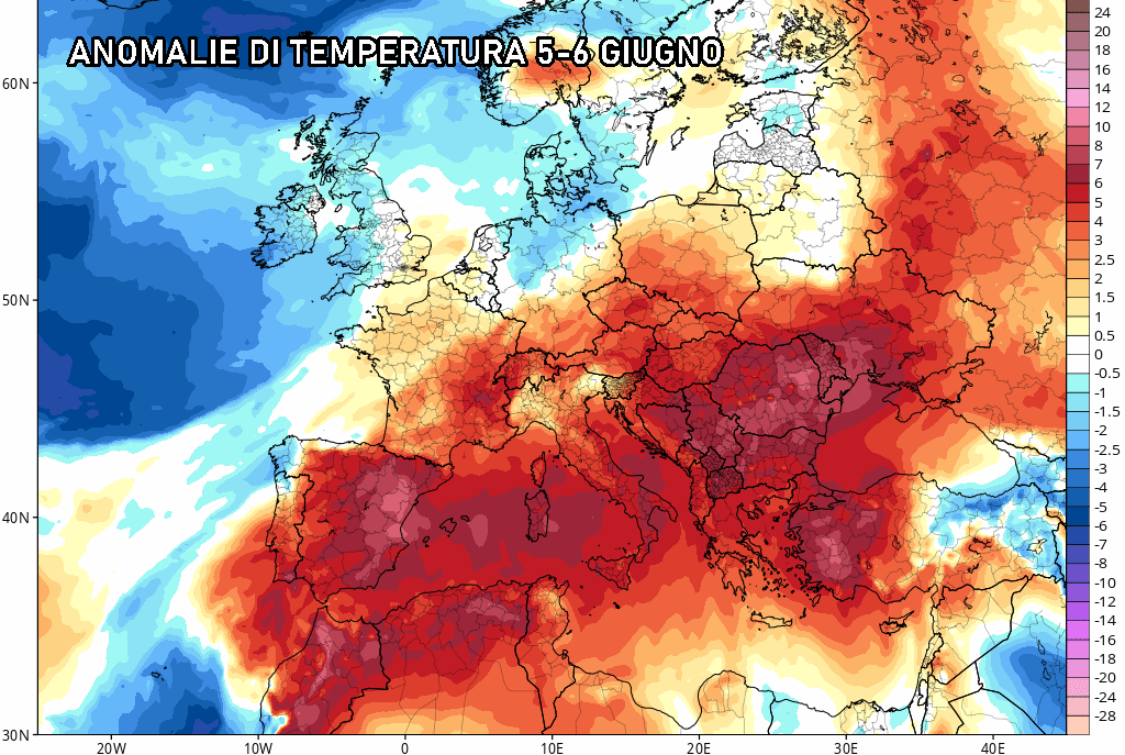 Il picco potremo raggiungerlo tra 5 e 6 Giugno, quando si prevedono fino a 7-9°C sopra le medie del periodo, ovvero temperature da piena estate!
