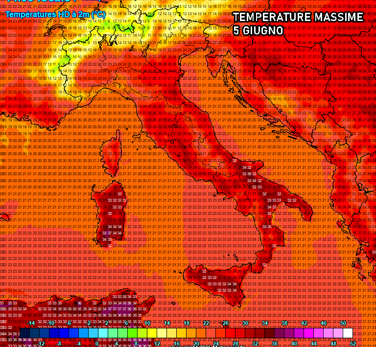 Eloquenti le massime previste al sud nel corso del 5 Giugno, secondo le prime stime indicative del modello GFS. Punte di 33-34°C su Puglia, Basilicata, Calabria, Sardegna, Sicilia e addirittura isolati picchi di 37°C sul cagliaritano. Temperature più basse al nord, dove ci saranno frequenti temporali.