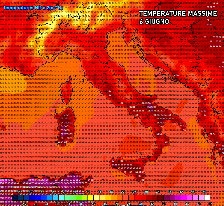 Ancor più alte le temperature il 6 giugno, specie su Sardegna, Campania, Basilicata e Puglia. Fino a 36°C nel foggiano, 37°C su cagliaritano e sud Sardegna. Anche in Sicilia spuntano picchi diffusi di 34-36°C.