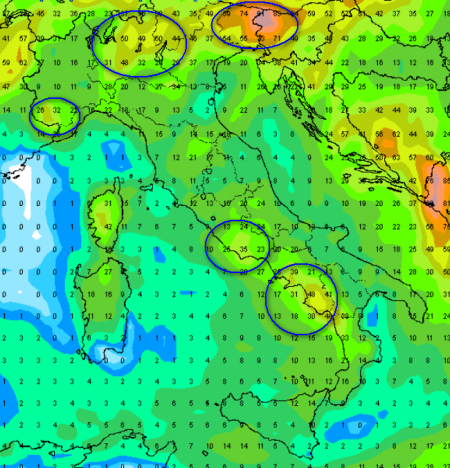 La fase piovosa attesa tra giovedì e domenica porterà un po’ di pioggia su quasi tutta Italia, in alcune aree si registreranno anche picchi superiori ai 30mm di accumuli, addirittura sulle Alpi orientali sino a 75mm di accumuli, ma su altre pioverà ancora troppo poco, come su alcune aree del Piemonte. E’ comunque una BUONA NOTIZIA perchè il passaggio di fronti nell’area mediterranea sta diventando più frequente, anche se non ancora così determinante per risolvere il problema siccità. Qui sotto ciascuno può osservare la sommatoria degli accumuli previsti dal modello americano sino a domenica: spiccano il Cilento, il basso Lazio, la Lombardia centro-orientale e gran parte del Triveneto e il Cuneese.
