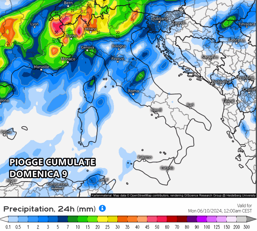 Eloquente la cartina relativa alle precipitazioni previste nella giornata di domenica 9 giugno, che ci mostra una situazione di forte maltempo su gran parte del Nord, con accumuli pluviometrici piuttosto importanti, anche superiori ai 70 o 80 mm. Insomma, si prevede una domenica decisamente ad alta tensione su tutto il nord, con rischio di piogge diffuse e soprattutto violenti temporali sulla Val Padana, dal Piemonte al Veneto.