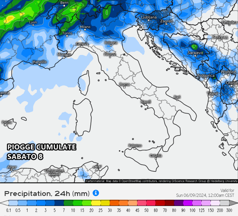 Dalla mappa seguente possiamo notare la presenza di precipitazioni già dalla giornata di sabato 8 giugno sulle regioni del Nord, soprattutto su aree montane e pedemontane. In verità, qualche isolato temporale di calore potrebbe già manifestarsi nella tarda sera di venerdì sulla Val Padana centro-occidentale, ma il grosso del maltempo è previsto durante il fine settimana.