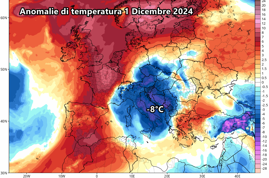 Eloquente l’intensità del freddo prevista il 1° Dicembre, primo giorno dell’Inverno meteorologico che esordirebbe con temperature di tutto rispetto. Sul Centro-Sud si prevedono fino a 8°C sotto la media del periodo: