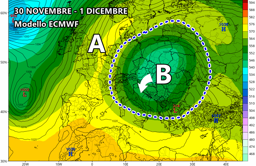 Il modello americano GFS preme per una forte irruzione fredda che scaraventerebbe gran parte d’Italia in pieno Inverno tra 30 Novembre e 1° Dicembre. La configurazione è una di quelle “perfette” per assistere a freddo e neve a bassa quota sull’Italia meridionale, sebbene la massa d’aria non risulterà estremamente fredda. L’anticiclone si rafforzerà su Francia, Germania e Russia europea, scatenando la retrogressione di un nucleo freddo di origine Artica.