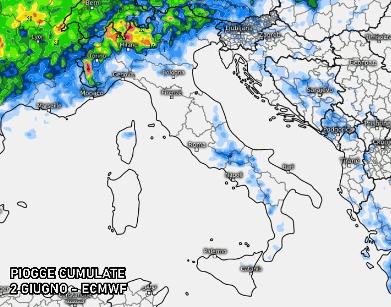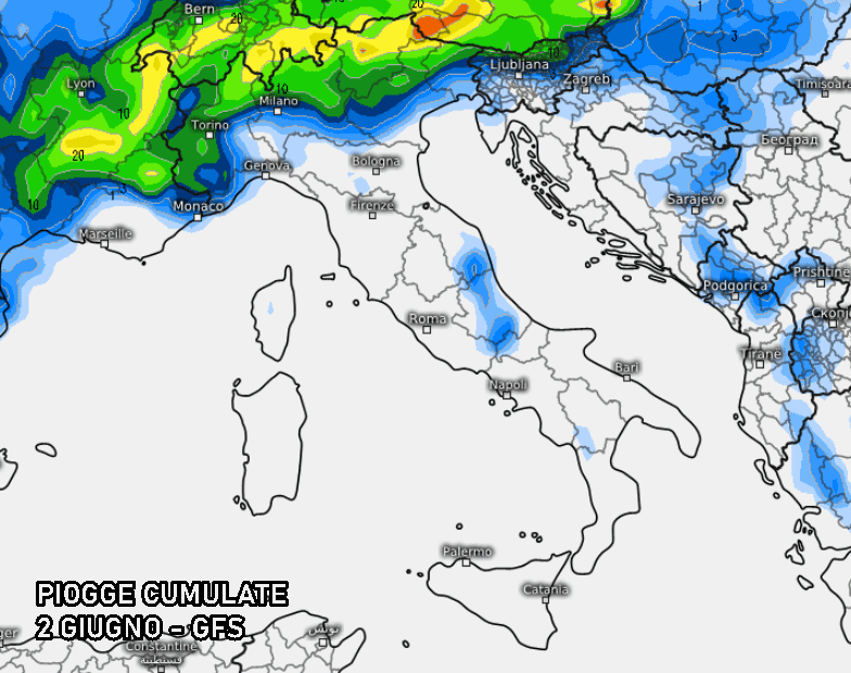Il 2 Giugno, dunque, potrebbe rivelarsi piuttosto turbolento soprattutto su Alpi, Prealpi e i settori a nord del Po come indicato dal modello americano GFS. Accumuli di pioggia sostanziosi sulla fascia alpina, anche oltre 30-40 mm, indice di temporali piuttosto forti. Insomma non sarà la giornata ideale per scampagnate in montagna. Anche le aree pedemontane e pianeggianti potrebbero rientrare in questo regime instabile, specie torinese, milanese, brianza, veronese, bresciano, vicentino.