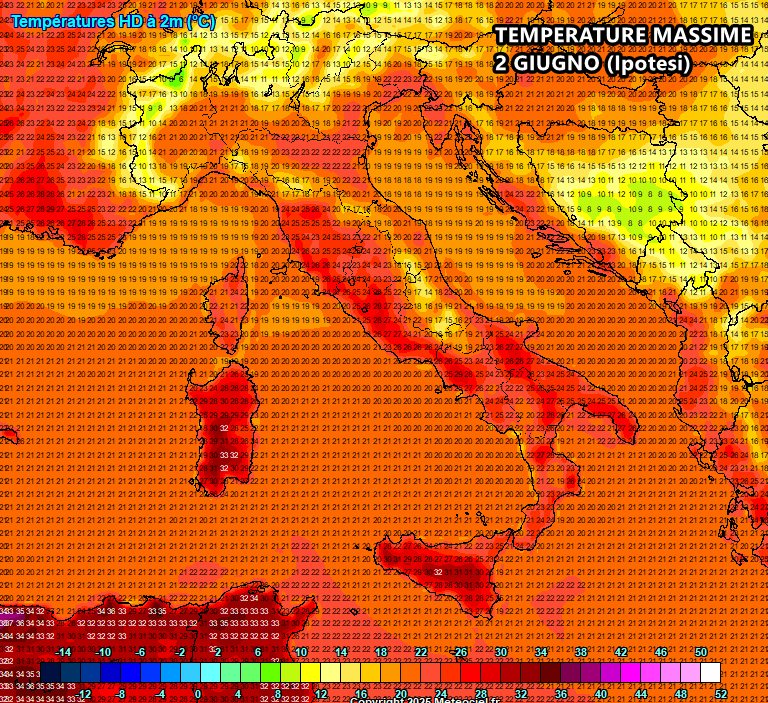 Le ultimissime stime riguardo le temperature del 2 giugno ci mostrano massime addirittura superiori ai 30 °C al Sud Italia e sulle isole maggiori, con picchi di 32 e 33 °C su Sardegna e Sicilia. Caldo anche al Centro, sebbene con temperature massime più contenute rispetto al Meridione: