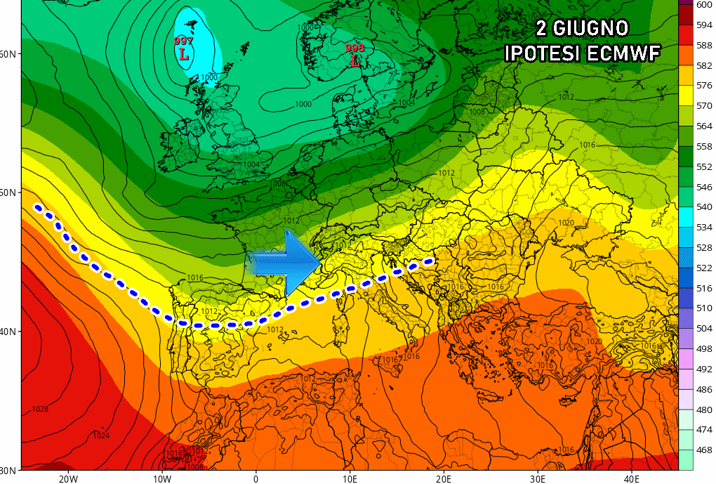 Ma attenzione, poiché la previsione non è ancora definitiva! A rompere le uova nel paniere ci pensa l’europeo ECMWF, che nell’aggiornamento mattutino mostra uno scenario decisamente diverso. L’alta pressione potrebbe collassare nuovamente proprio durante la festa della Repubblica, causando l’ingresso di aria fresca e fortemente instabile dall’Atlantico. Questa potrebbe danneggiare il tempo su tutto il nord con numerosi temporali ed un conseguente calo termico.