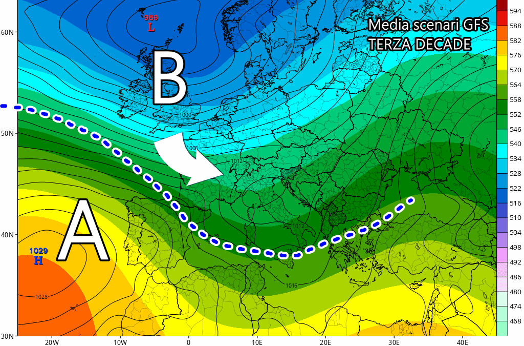 Il modello americano GFS, come potete osservare nell’immagine di copertina in alto, propone la discesa di un vero e proprio fiume d’aria fredda dalla Groenlandia verso l’Europa, capace di allungarsi sin verso l’Italia nel corso della terza decade del mese. Con questa dinamica tornerebbe finalmente l’inverno, con immenso ritardo, sulle regioni del nord e con potenziali nevicate a quote interessanti.