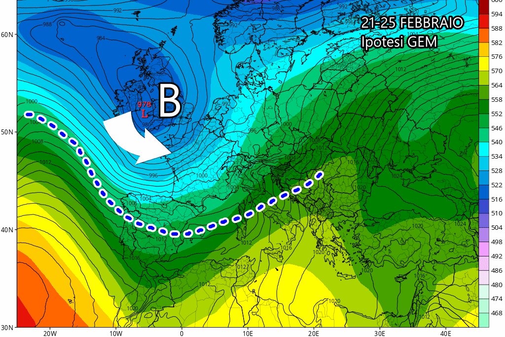 Anche la media degli scenari di GFS è favorevole con questo nuovo schema barico, che vede l’anticiclone finalmente lontano dall’Italia ed il Mediterraneo bersagliato dalle correnti nord-atlantiche. Quando tutto questo? Precisamente nella terza decade del mese, indicativamente tra il 21 e il 25 febbraio.