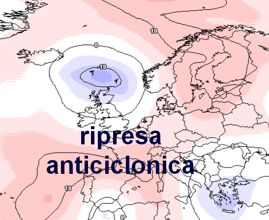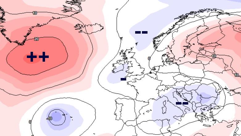 In azzurrino noterete le aree con pressione inferiore al normale a 5500m di quota e questo depone per lo sviluppo di un canale depressionario tra il Mar di Norvegia e l’Italia con conseguenti PIOGGE frequenti, parallelamente si nota la presenza di aree in marrone che sottendono la presenza di anticicloni e dunque di tempo buono.