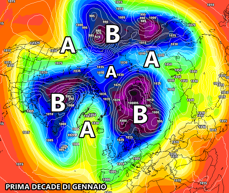 Per essere più chiari, potrebbe verificarsi un triplice attacco delle alte pressioni verso il Polo Nord: l’alta pressione siberiana, l’alta pressione delle Aleutine e l’alta pressione delle Azzorre potrebbero insidiare il vortice polare, portandolo a una repentina distruzione in vari lobi, i quali tenderanno a muoversi verso latitudini inferiori.