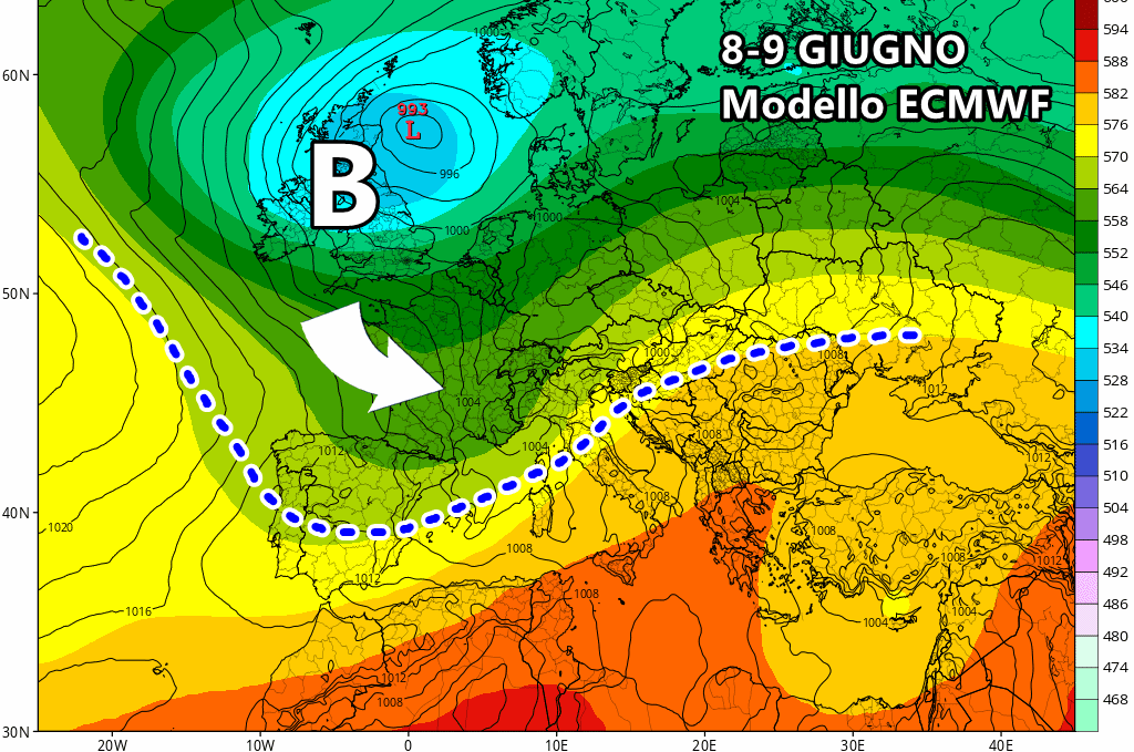 Il modello europeo ECMWF non è ancora d’accordo con questa evoluzione meteo. Il ritorno dell’anticiclone attorno al 5-6 giugno potrebbe rivelarsi davvero una toccata e fuga, considerando che nei giorni successivi ci propone una nuova perentoria discesa di aria fresca nord atlantica che potrebbe determinare un nuovo violento peggioramento principalmente al Nord Italia. Eloquente la mappa appena elaborata dal modello europeo che propone tra l’8 e il 9 giugno una nuova forte ondata di maltempo a suon di forti temporali, grandinate e nubifragi su gran parte del Centro Nord.