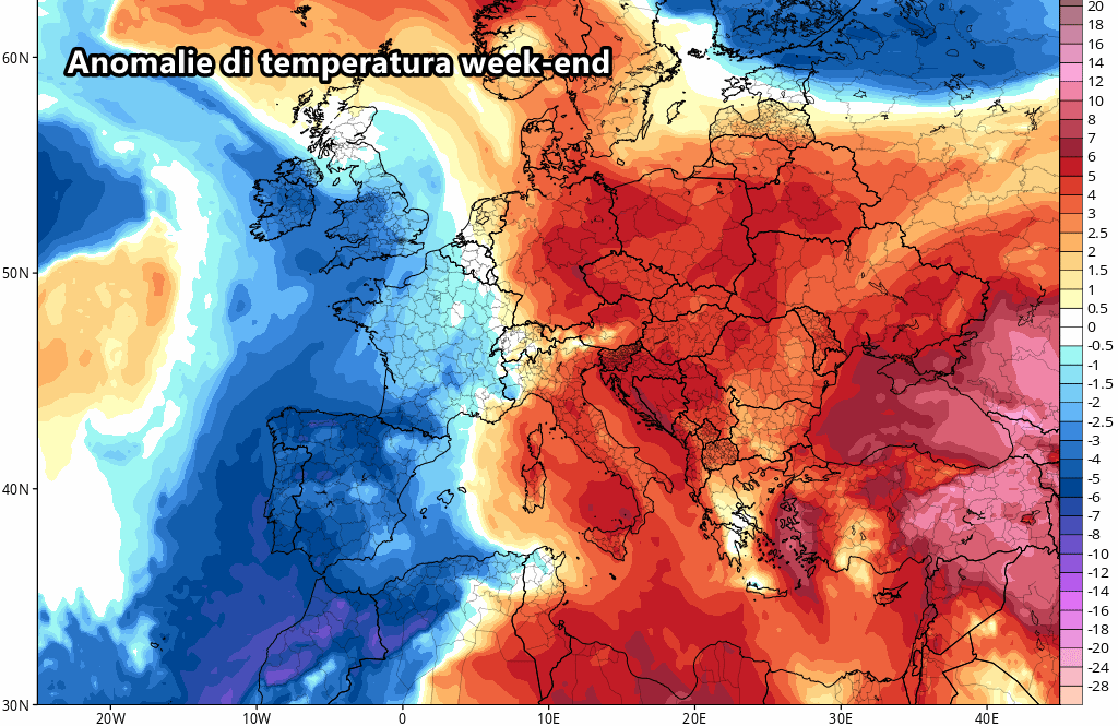 Di seguito possiamo osservare le anomalie di temperatura previste durante il weekend. Bene, possiamo già notare un netto incremento termico su tutta Italia e l’Europa centrale, col freddo in totale ritirata e l’arrivo di correnti più tiepide da sud. Merito senz’altro di un approfondimento delle depressioni sull’Europa occidentale che favoriranno la risalita di aria calda nord africana nel Mediterraneo centrale.