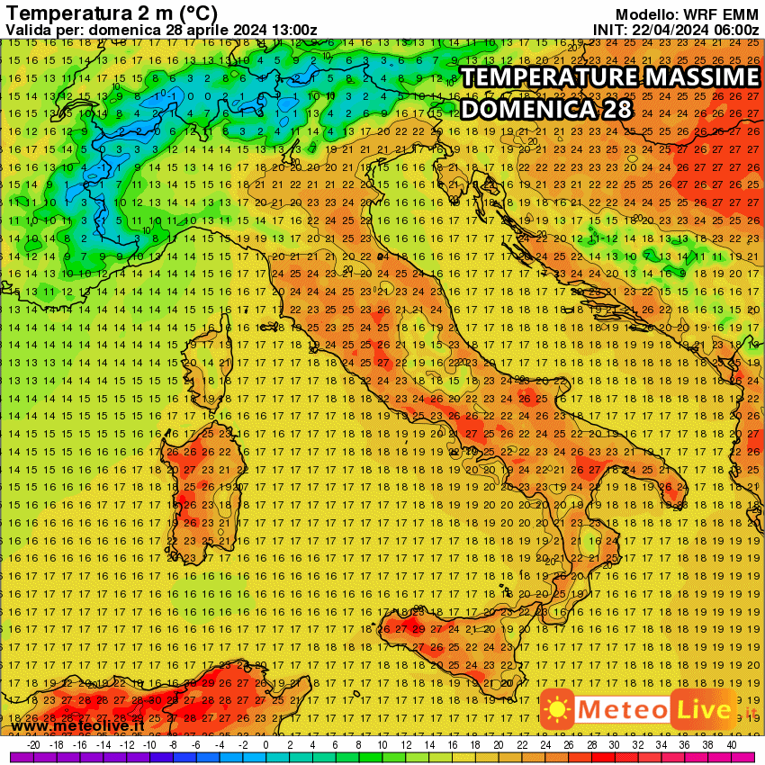 Eloquenti le temperature massime previste questa domenica su tutta Italia con punte fino a 25 o 27 ° nelle zone interne. Anche al Nord le temperature sono attese in sensibile incremento con punte di oltre 23 o 24 ° sulla Val Padana orientale.