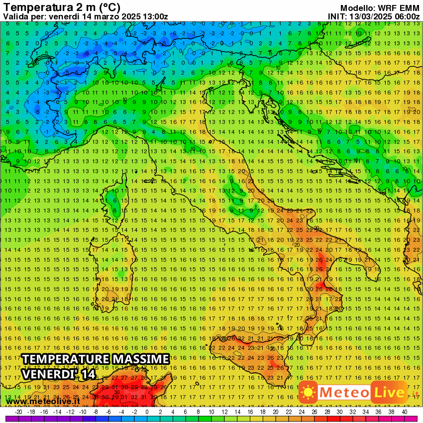 Le temperature massime di venerdì supereranno agevolmente i 20°C su quasi tutto il Sud e il medio-basso Adriatico, ma ciò che più colpisce sono i picchi di oltre 26-27°C nelle zone interne, dalla Puglia alla Sicilia. Non si esclude il raggiungimento dei primi 30°C sulle aree costiere tra il Palermitano e il Messinese. Insomma, parliamo di valori degni del mese di giugno.