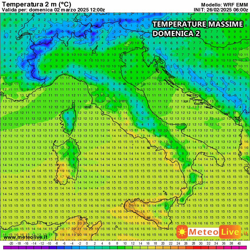 Eloquente il quadro delle temperature massime previste nella giornata di domenica, che saranno molto simili a quelle di sabato. Al Nord, troveremo massime attorno agli 8 o 10°C sulla Val Padana orientale, fino ad arrivare a 5 o 6°C sull’estrema Val Padana occidentale. Man mano che ci spostiamo verso Sud, notiamo un graduale aumento delle temperature, fino a raggiungere picchi clamorosi di 19 o 20°C sulla Sicilia. Insomma, il Sud Italia vivrà un weekend tutt’altro che invernale, con un clima più primaverile sotto l’aspetto termico, mentre ricordiamo che sarà altamente probabile la presenza di nubi, piogge e temporali.