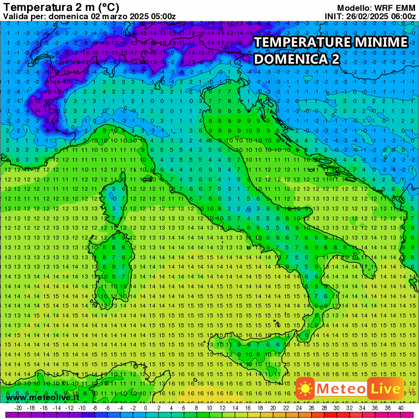 Anche di notte, il freddo sarà maggiormente presente al Nord, con minime che potrebbero sfiorare lo zero sulla Val Padana. Temperature minime molto più alte, invece, al Sud, dove la colonnina di mercurio faticherà a scendere sotto i 12 o 11°C nelle città pianeggianti e costiere.